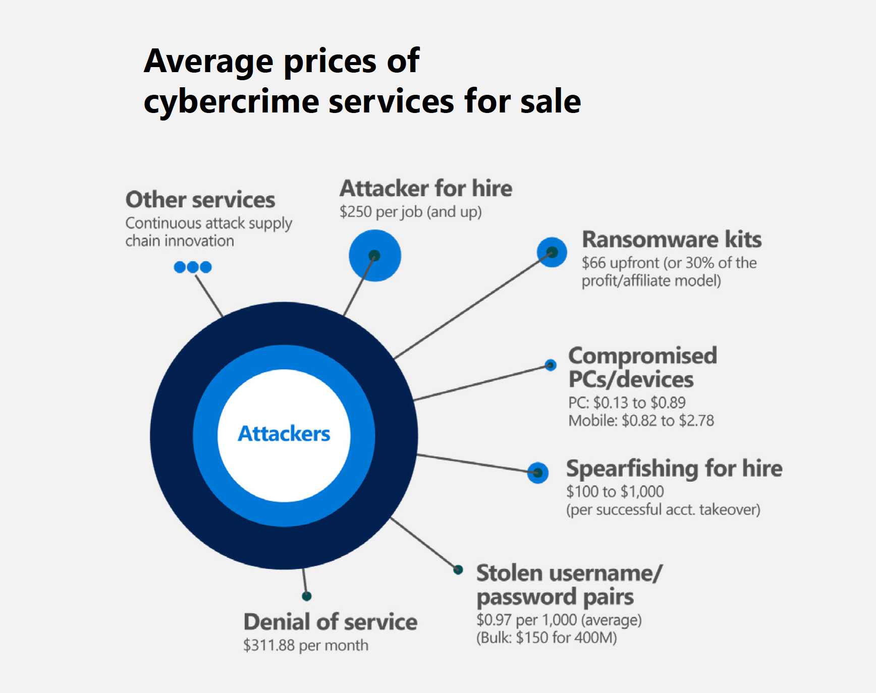 Oggi è possibile acquistare kit ransomware, attacchi DDOS, credenziali compromesse e molto altro: sono a tutti gli effetti delle armi cibernetiche a disposizione attori criminali che non hanno le capacità tecniche di realizzarle in proprio.