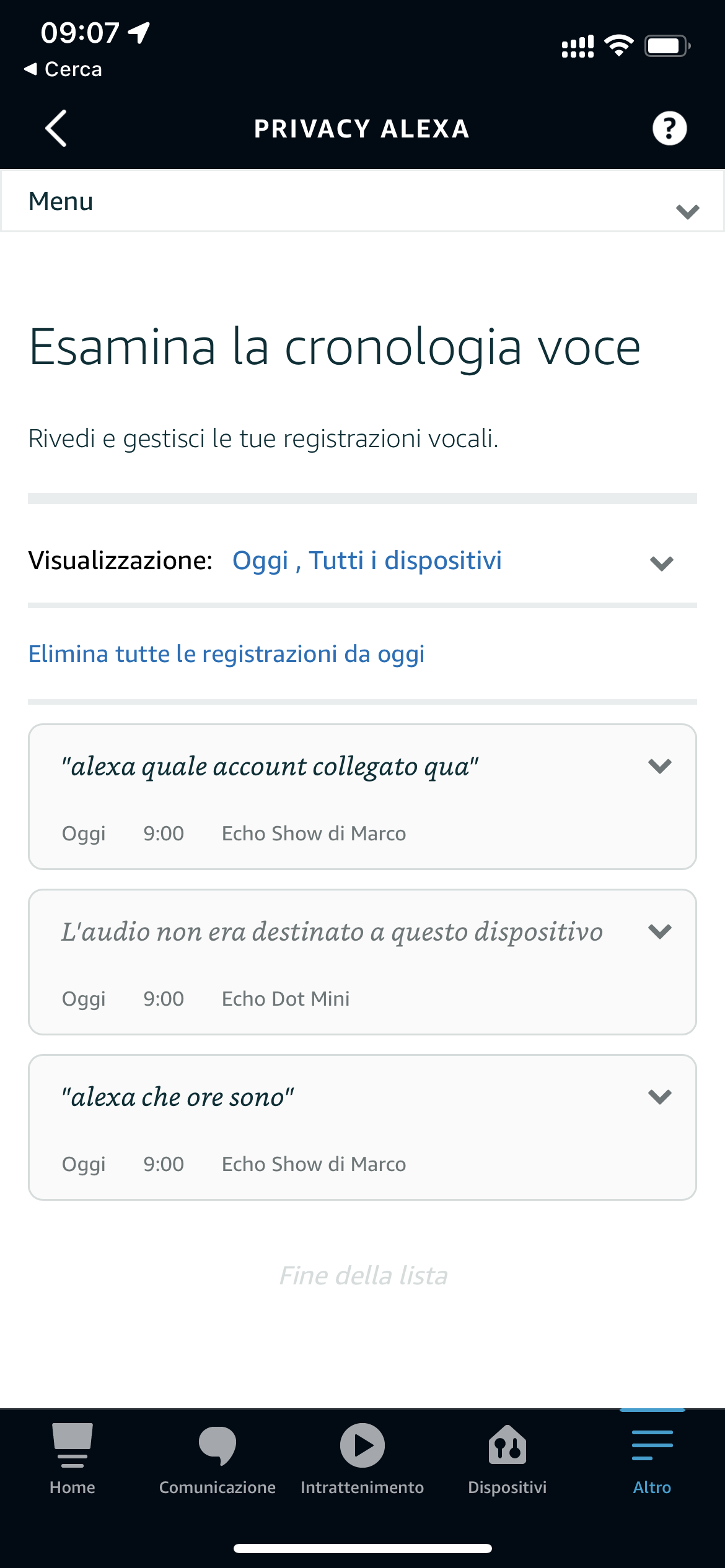 Così, come ha fatto l'autrice del Tweet, sono andato a vedere cosa ha registrato il mio Alexa, che tengo a casa, di finaco alla TV. Basta entrare nell'applicazione, poi menu "Altro" -> "Impostazioni" -> "Privacy".