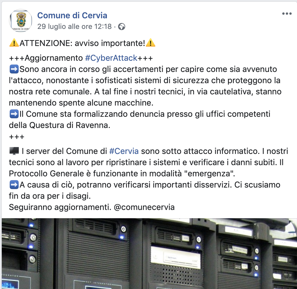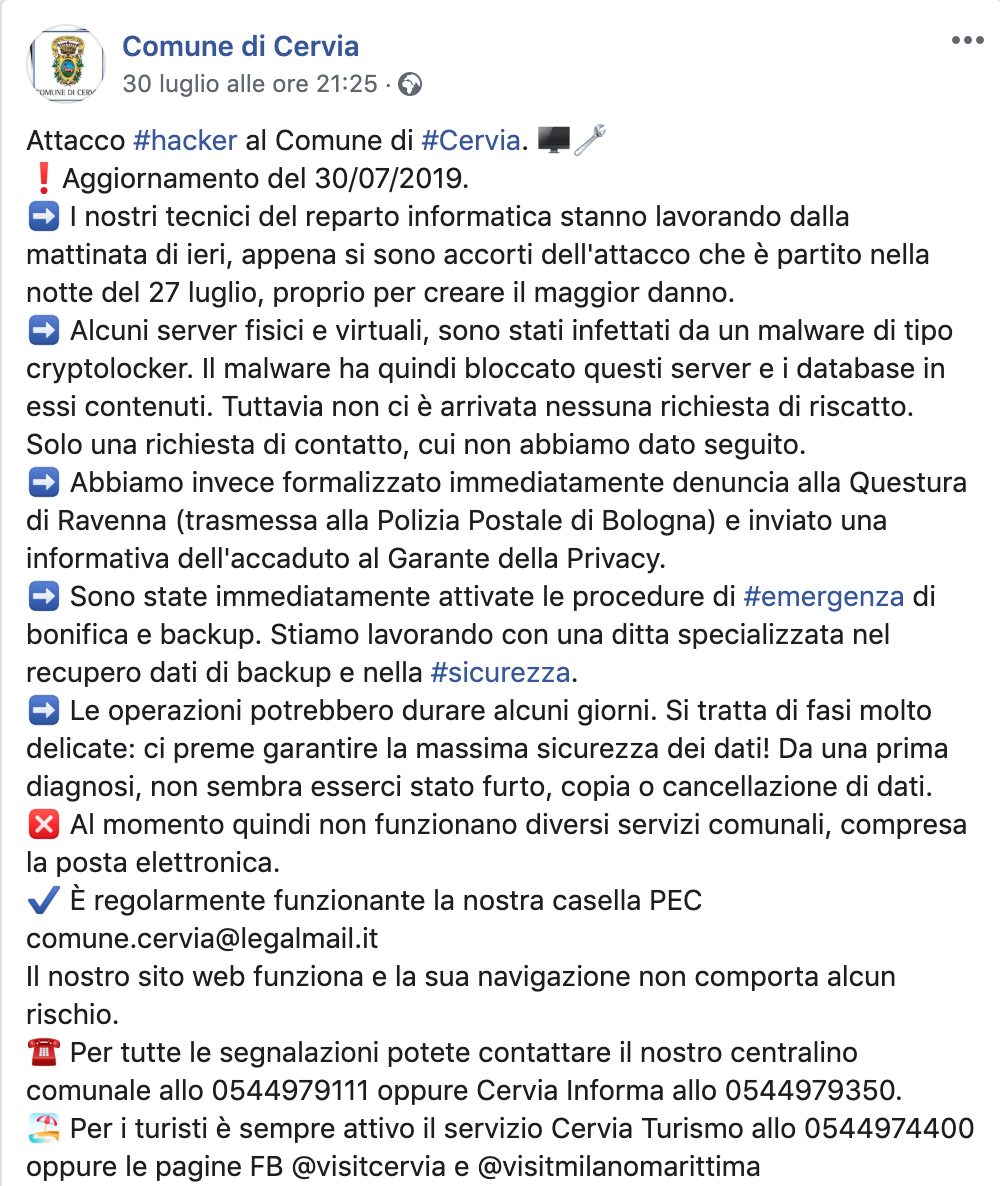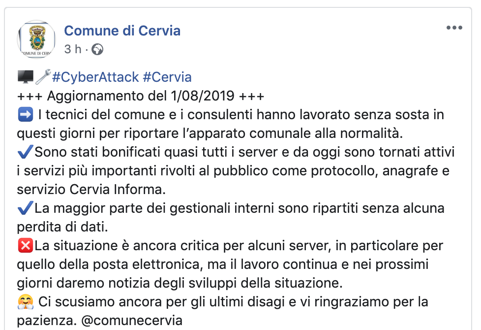Sulla pagina Facebook del Comune di Cervia compare un aggiornamento, circa 5 giorni (120 ore) dopo l'attacco informatico: