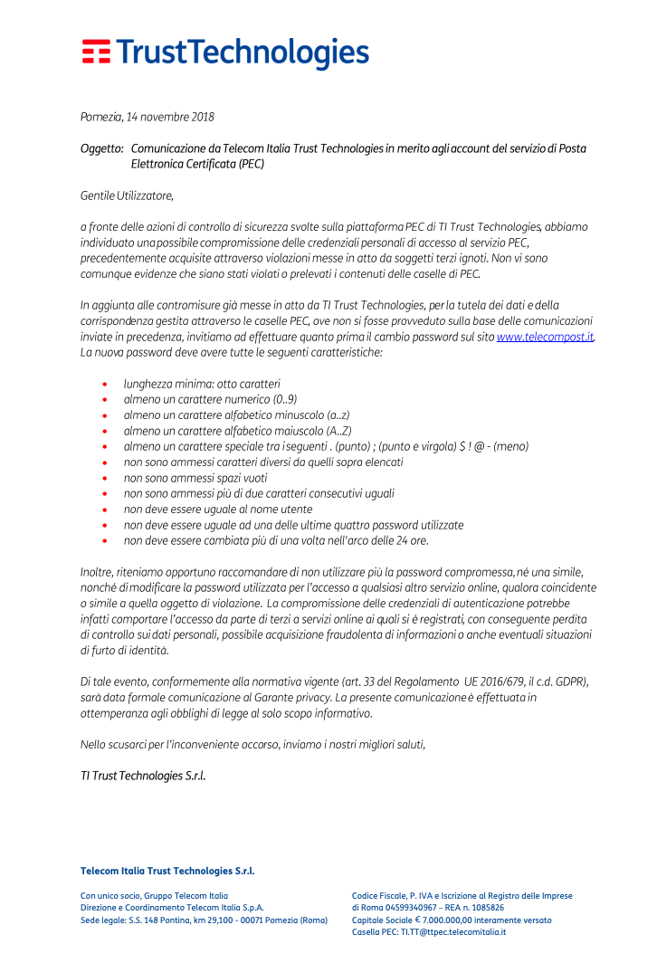 A conferma di ciò, il giorno successivo, 14 Novembre, il fornitore Trust Technologies invia una comunicazione agli utenti ammettendo il breach e obbligando i clienti al cambio delle password. Questa la comunicazione (che ho ricevuto anche io, avvalendomi appunto di questa tecnologia):