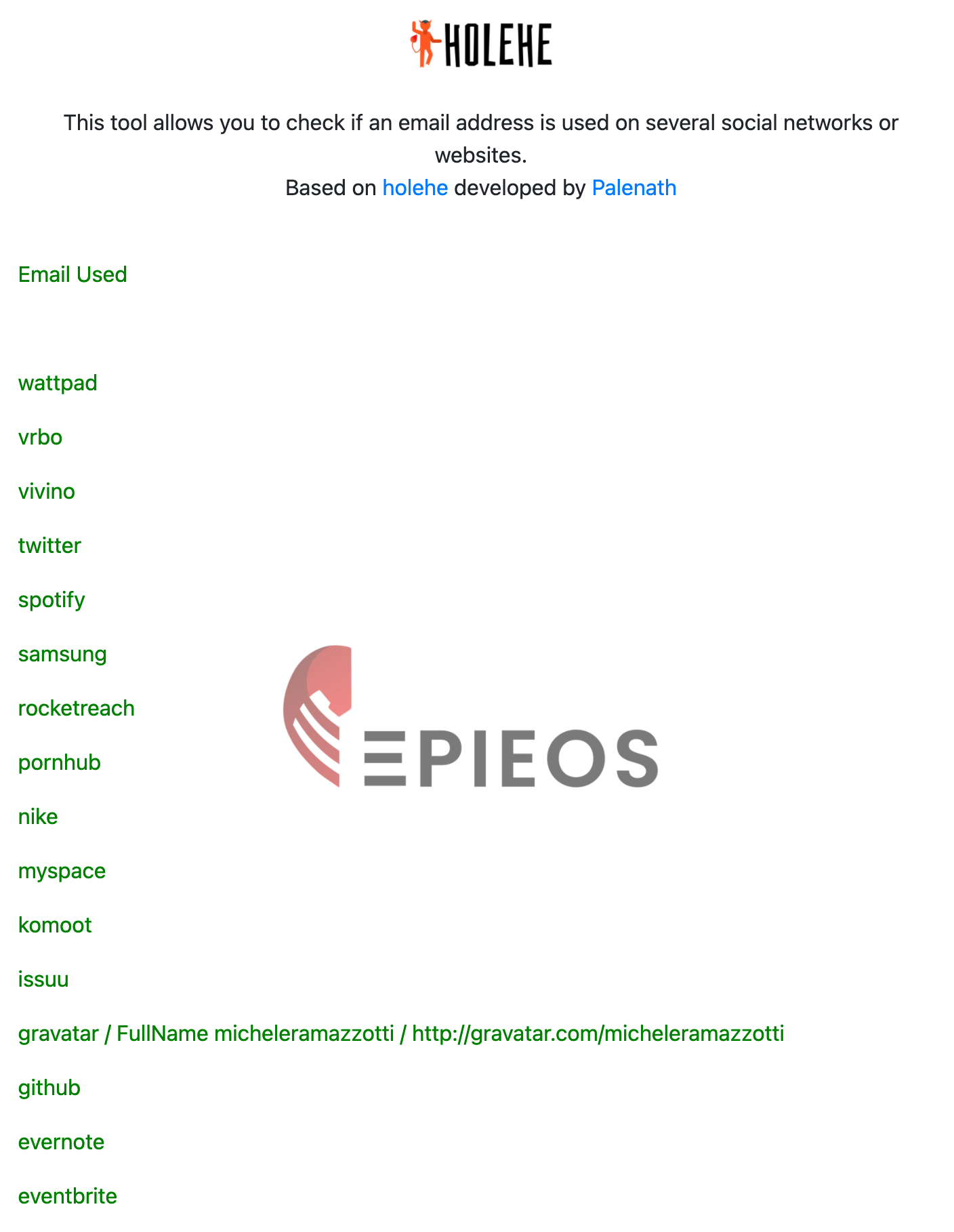 A questo punto, avendo anche l'indirizzo email, il criminal hacker può cercare in quali altri network è presente lo stesso indirizzo, ad esempio con un tool come Holehe: