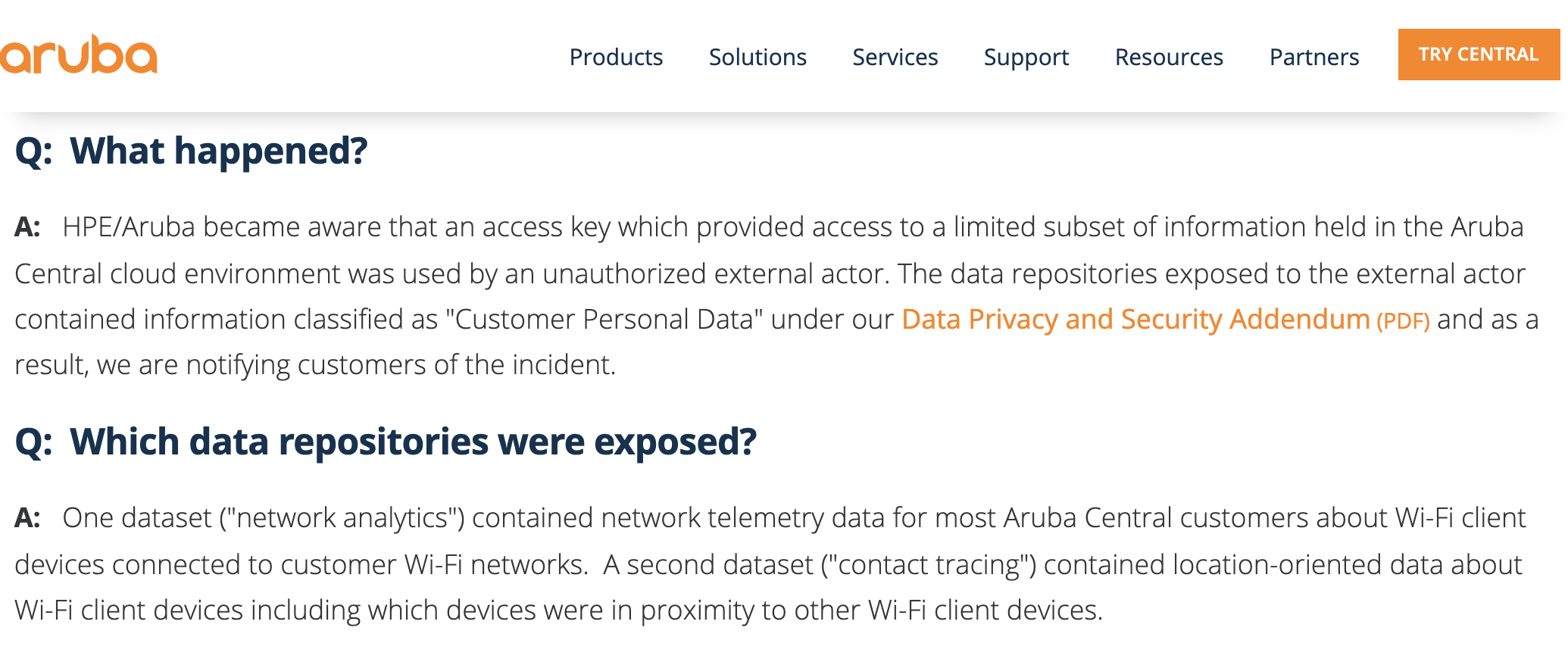Questo tipo di indicente può però avere conseguenze non indifferenti: se è vero che gli attaccanti sono riusciti ad avere informazioni dettagliate sui clienti di Aruba Central, potrebbero usarle per successivi attacchi.