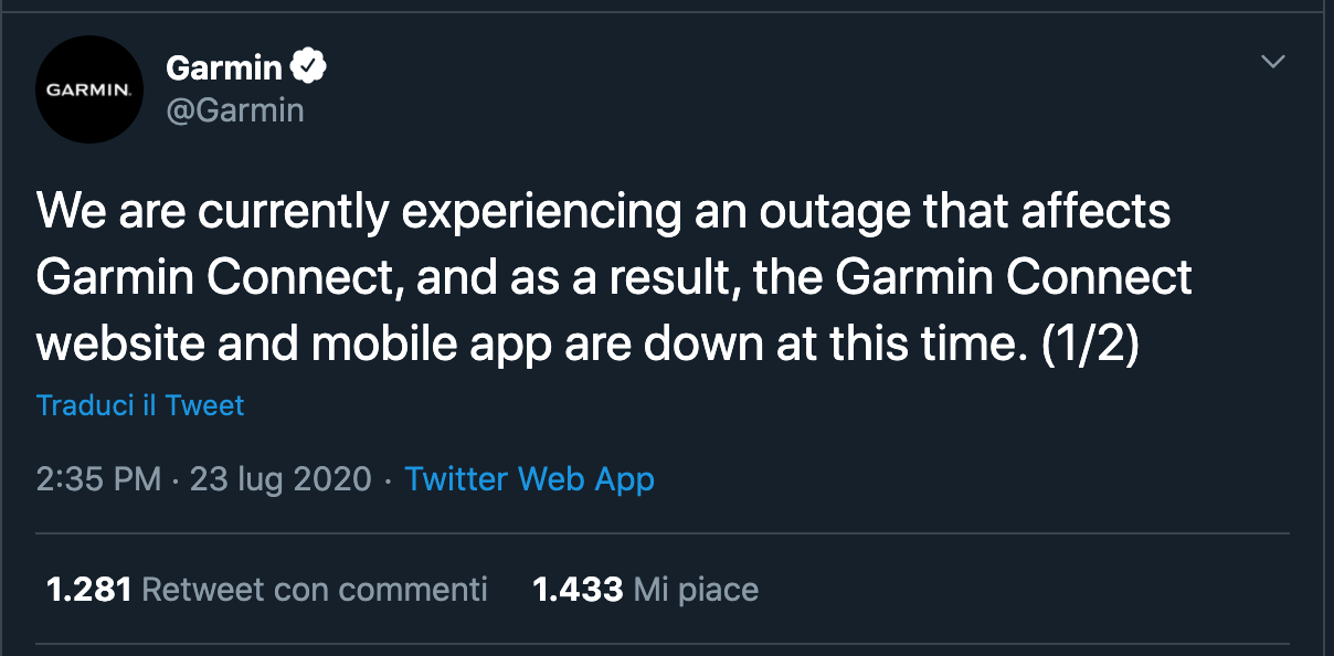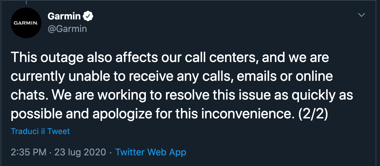 Oltre al fatto che tutti i sistemi fossero offline, il Tweet della stessa Garmin lasciava poche interpretazioni: anche i call center, email e chat erano inutilizzabili come canale di comunicazione. Garmin era completamente isolata dal mondo digitale.