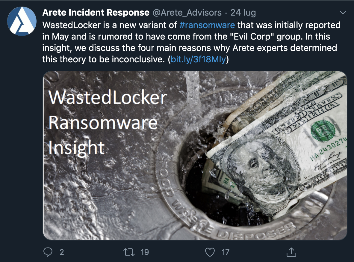 "Cari amici di Garmin, siete stati colpiti da un nuovo ransomware chiamato WastedLocker, che tutti collegano alla Evil Corp. Ma non è così. Noi sappiamo come funziona e possiamo dimostrarlo. PS: gli uffici sono aperti fino alle 19. Saluti"