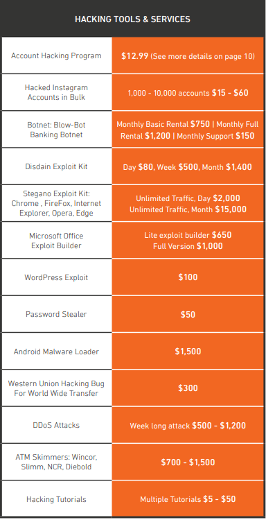 Questo nuovo livello di accesso a queste attività illegali apre nuovi scenari prima impensabili: a questo punto anche un “semplice” concorrente, oppure un ex dipendente, può attaccare una infrastruttura informatica, semplicemente pagando. Stiamo parlando di azioni punibili dalla legge ma che per la loro natura, essendo “diluite” e coperte da sistemi di crittografia, risultano molto difficili da rintracciare. Come potete vedere nelle tabelle qui riportate, molti sono i crimini che si possono “ordinare”.