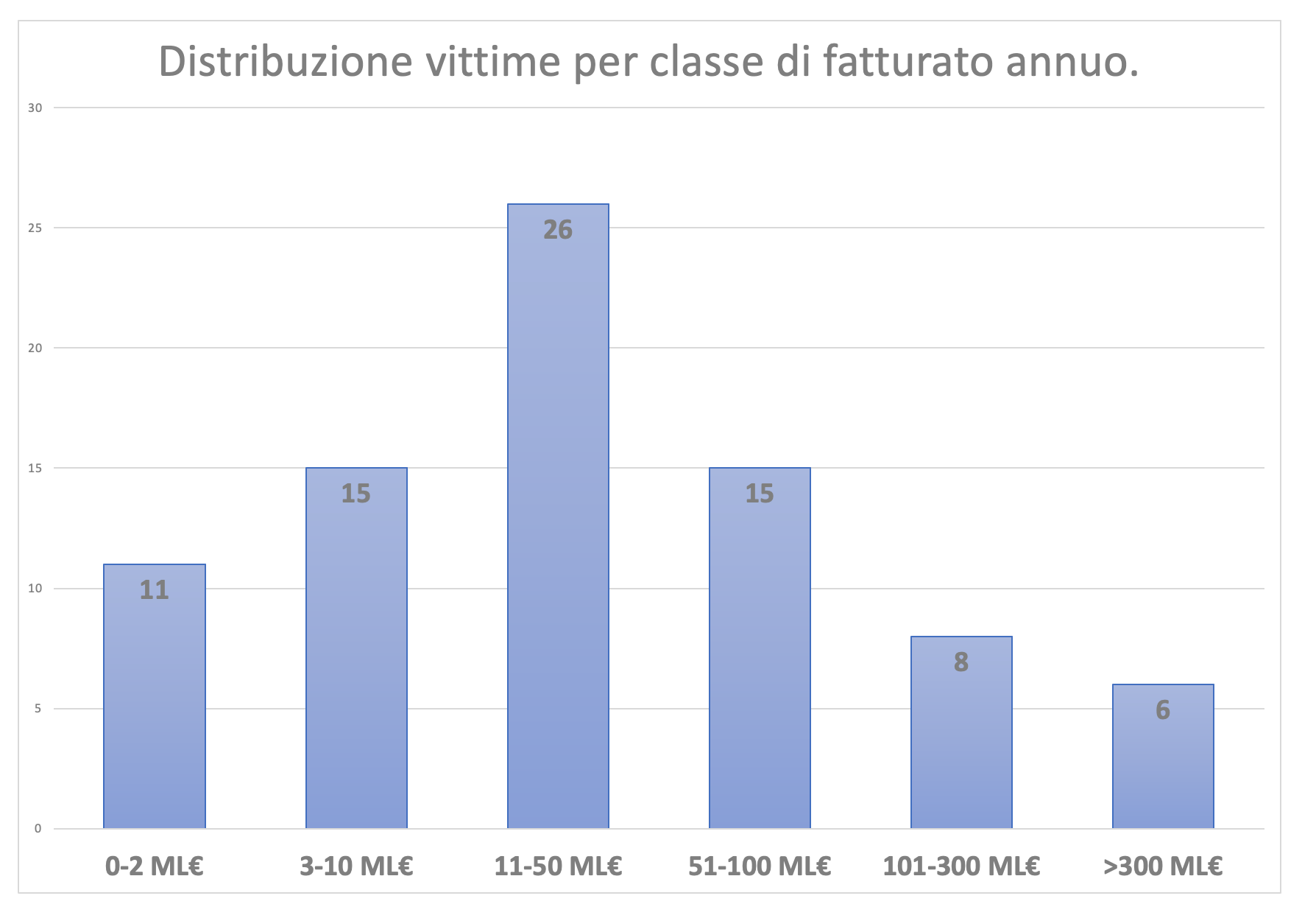 Il grafico mette in chiara evidenza come aziende che fatturino meno di 100ML€/anno siano il bersaglio "preferito" per questo tipo di attacco. In particolare la fascia 11-50ML€/anno è quella più colpita: non è un caso, in quanto si tratta in buona parte di PMI, il tessuto portante della nostra economia.