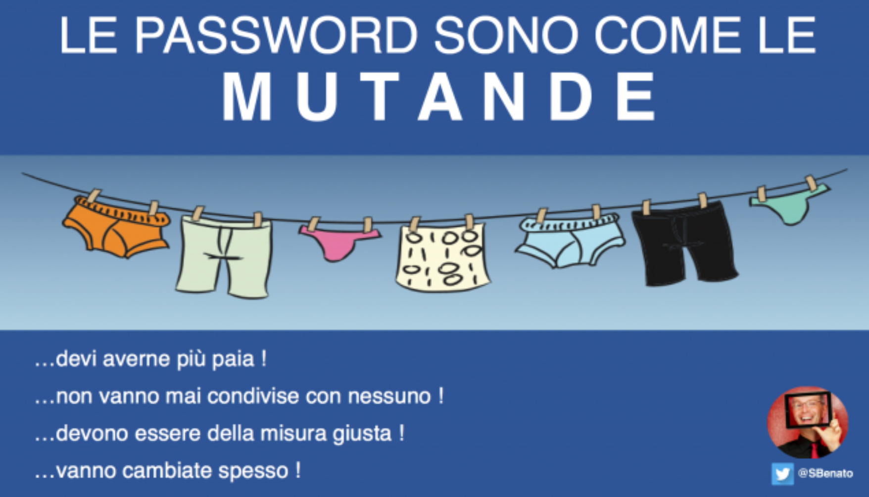Quando tocco questo tema nei miei incontri formativi sulla cybersecurity, utilizzo spesso un’immagine che ho trovato e “rubato” da Stefano Benato, esperto di sicurezza informatica e blogger, perché spiega in modo semplice e veloce come e perché dobbiamo usare le password: