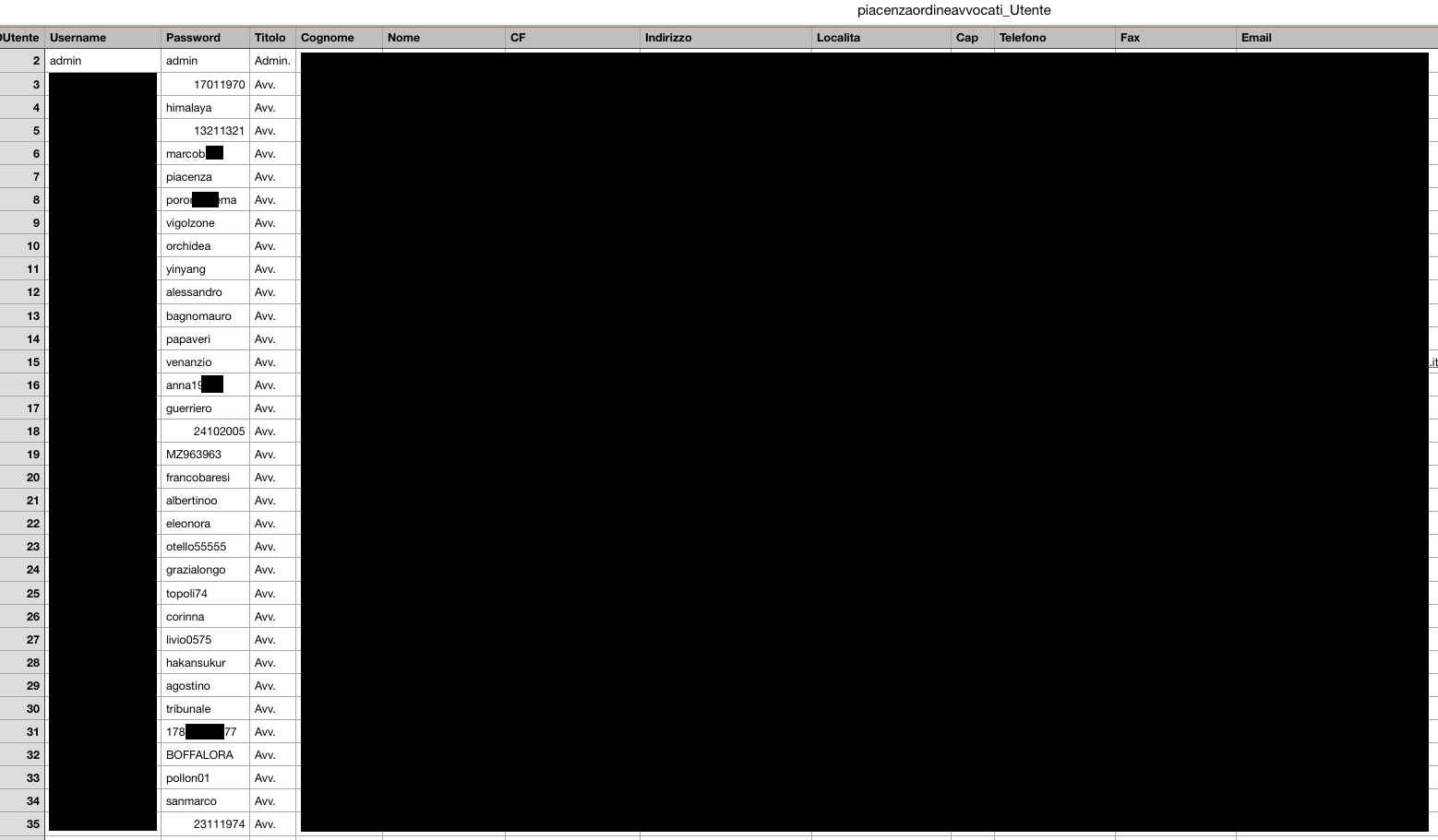 Nei file trafugati dall’ordine degli avvocati di Roma, ci sono alcune tabelle che contengono le credenziali di accesso delle caselle email PEC degli avvocati stessi (tra cui, il sindaco di Roma Virginia Raggi). Ovvero, era possibile trovare in rete nome, cognome, indirizzo email, nome utente e password di circa 30.000 (TRENTAMILA) avvocati romani. Quella qui sotto è una schermata dove si possono vedere le password utilizzate dagli avvocati.