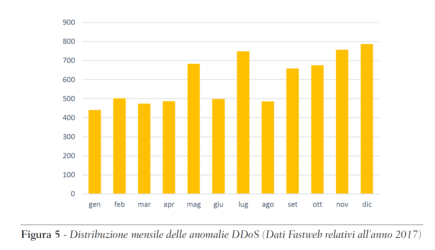 Ricordo inoltre che oggi è possibile acquistare nel Dark Web, attacchi DDOS per poche decine di dollari. Anche per questo motivo, la quantità di attacchi di questa natura, è aumentata notevolmente in Italia. Ecco i dati rilevati sulla sola rete Fastweb nel 2017: