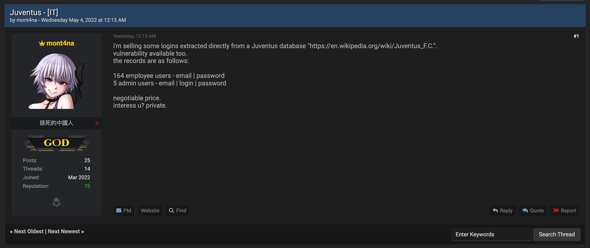 Partiamo dalla fine: proprio ieri, sul noto forum BreachForum - luogo dove i criminali informatici annunciano gli attacchi portati a termine, cercano affiliati e mettono in vendita informazioni sensibili - è comparso un messaggio che riguarda uno dei più famosi club calcistici italiani: la Juventus.